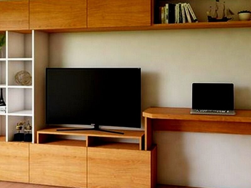 Un mueble multifuncional que combina espacio para la televisión, almacenamiento de medios, estanterías y vitrinas para exhibir objetos decorativos.