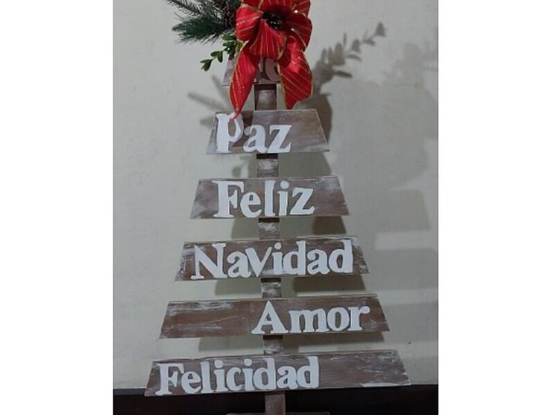 Árbol Feliz Navidad. Medidas 110 cm de alto Material: madera de pino. Acabado: Anejado con frases navideñas, las decoraciones son opcionales.