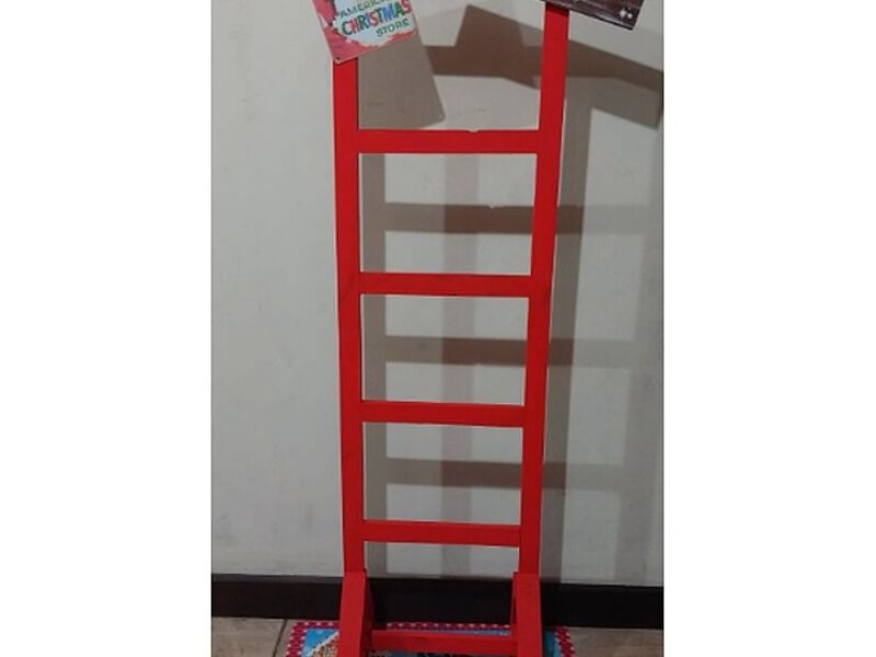 Escalera para botas. Medidas 120 cm de alto Material: madera de pino. Acabado: Color rojo o natural con rotulo de frase navideñas, Solo tenemos uno con el rotulo de santa.