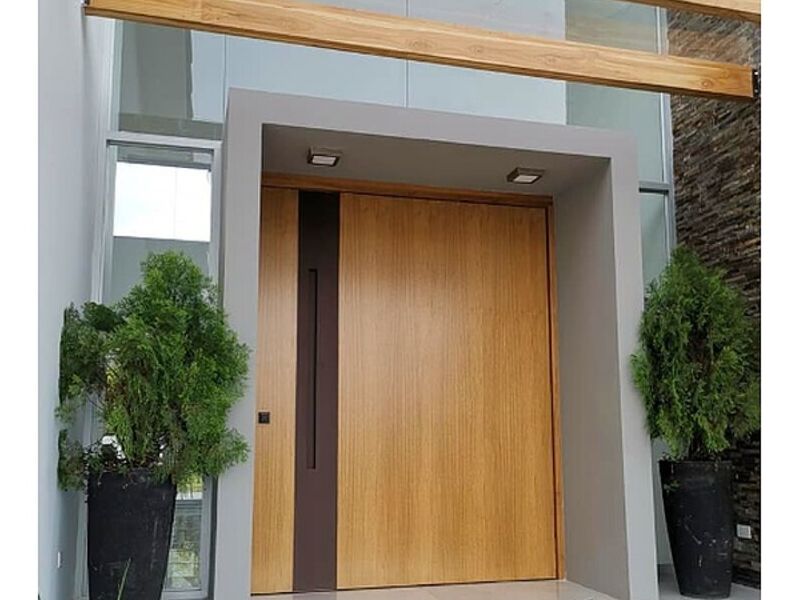 Hoy nos encontramos nuestra puerta viga Alma Viva frente a otra puerta instalada hace unos meses, esta en estilo clásico en madera de Cedro.