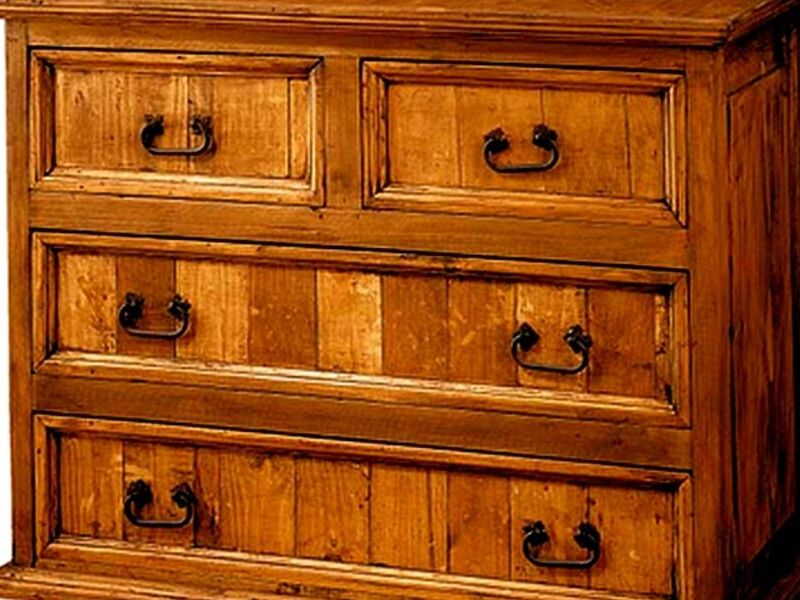 Una cómoda de madera con acabado envejecido y herrajes de metal forjado, perfecta para el dormitorio o la sala de estar.