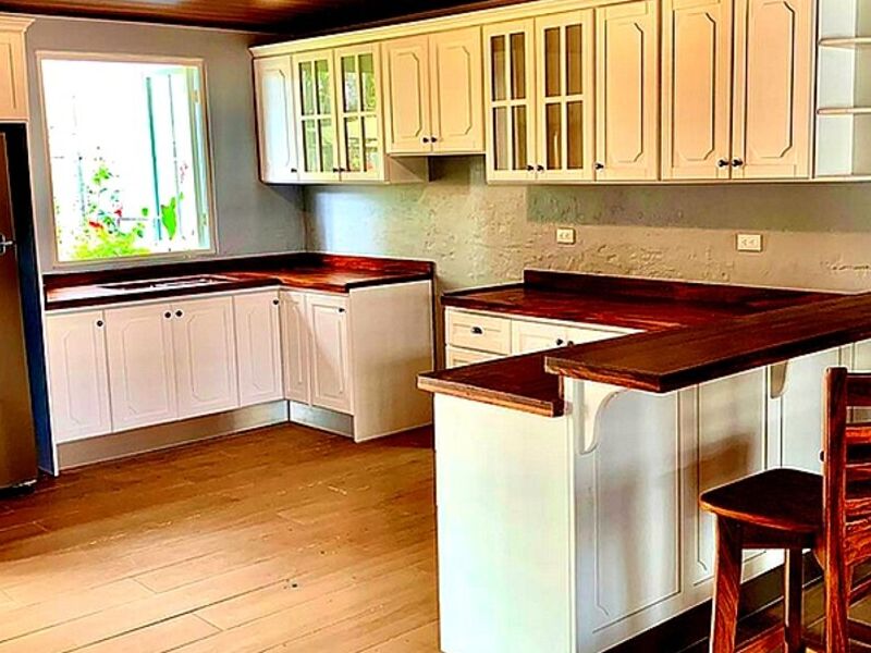 Mueble cocina hecho en madera sólida acabado blanco, sobre de madera.