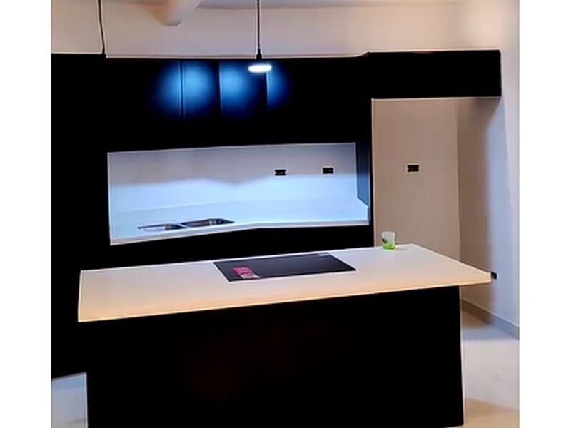 Cocina melamina hidrofuga negra, con cuarzo blanco puro.