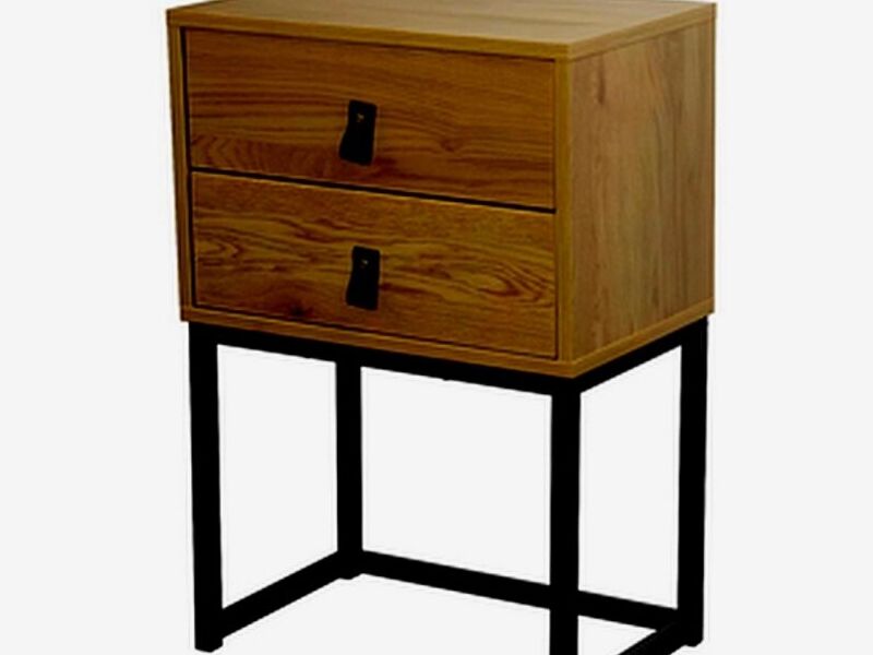 Mesa de noche con cajones de madera y detalles metálicos, combinando funcionalidad y estilo.