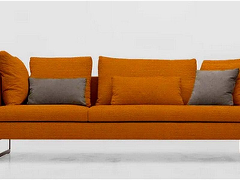 Sofá con estructura de madera y tapizado en tela, con detalles metálicos para un toque industrial.