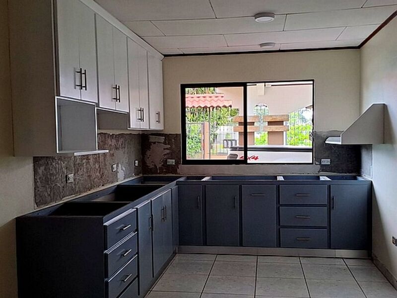 Cocina completa fabricada en madera de cedro con combinación de colores blanco y gris.
