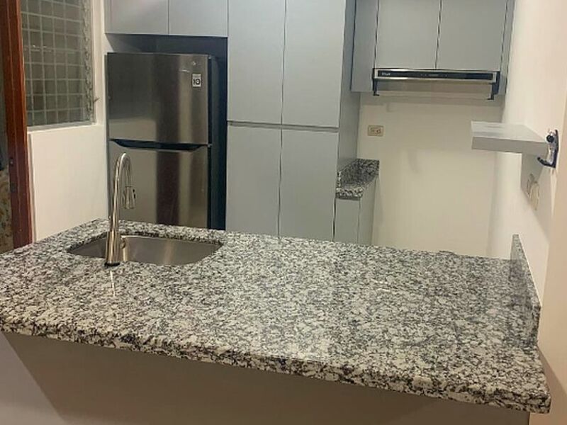 Cocina en Melamina Gris humo, sobre en granito Gran Perla.