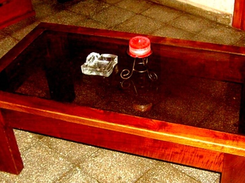 Mesa de centro sólida de cedro, con detalles tallados y espacio de almacenamiento.