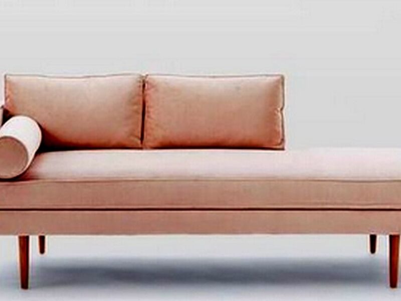 Un sofá diván de diseño moderno con líneas limpias y detalles cromados, perfecto para ambientes contemporáneos.