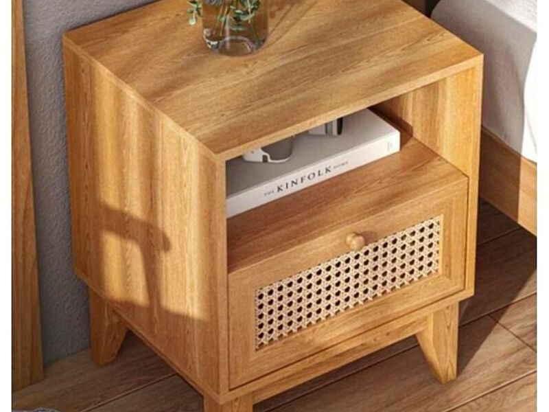 Mesas de noche de ratán con un elegante diseño entrelazado, aporta un toque bohemio y natural a tu dormitorio. Sus líneas suaves y su acabado cálido hacen de esta mesa un complemento perfecto para crear un ambiente acogedor.